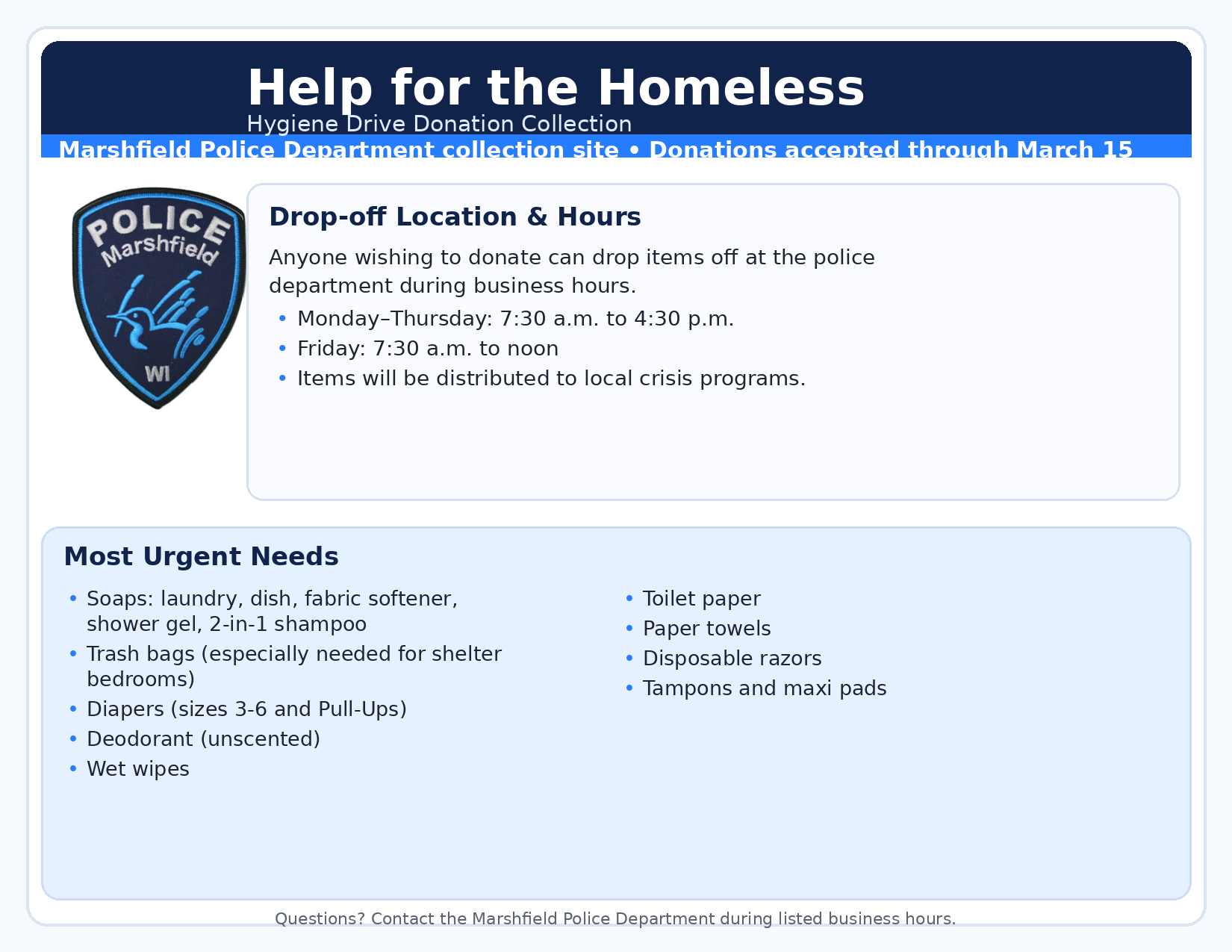 The police department is again serving as a drop-off site for the Help for the Homeless Hygiene Drive, with donations accepted through March 15.