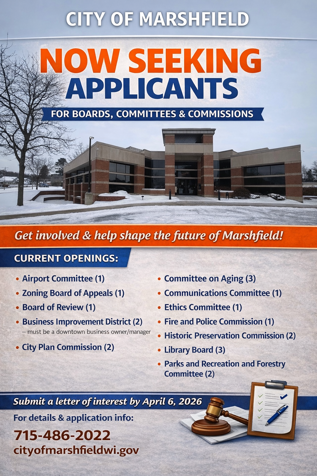 The City of Marshfield is inviting residents to apply for openings on various City boards, committees, and commissions. These positions provide an opportunity for community members to take an active role in local government and contribute to decisions that shape the future of Marshfield.